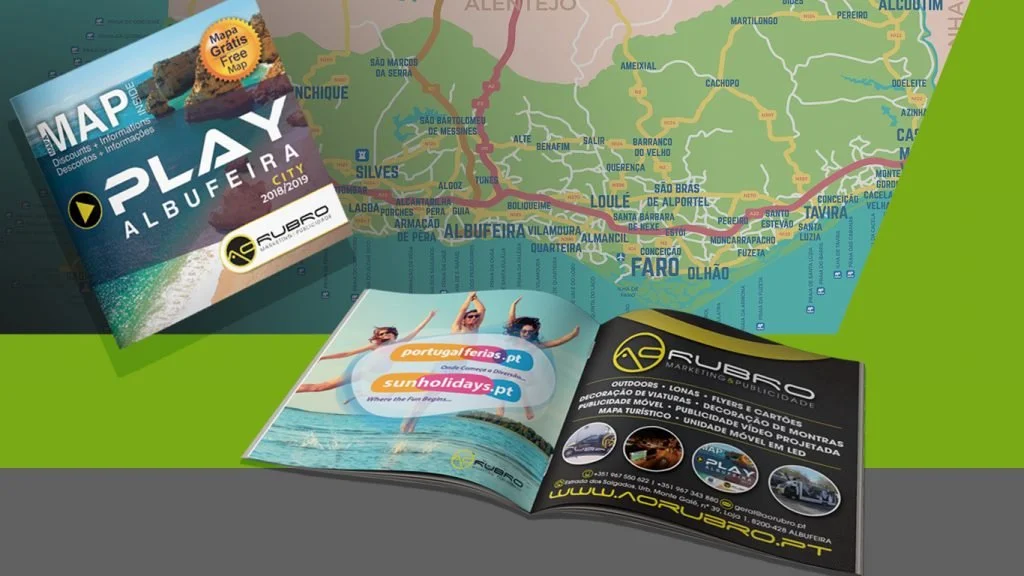Een collage van diverse marketing en reclame gerelateerde materialen zoals een brochure, smartphones en tablets met webpagina's, een geel sportauto met reclame op de zijkant, een visitekaartje en een rood T-shirt met een logo, die samen een promotieve presentatie vormen.